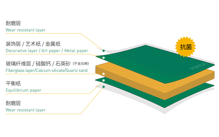 • 福爾卡?醫(yī)耐板?(玻纖復(fù)合不燃板)是由耐磨層、裝飾層、玻璃纖維層、硅酸鈣、石英砂(不含石棉)和平衡紙,表面經(jīng)過三聚氰胺樹脂與特種改性樹脂浸漬層疊后高溫高壓而成,產(chǎn)品的密度不低于1650KG/m3,厚度從4mm 到12mm,形成了整體A級防火、密度高、硬度高、表面毛孔很小的纖維板。
